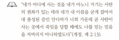 예수께서 이 안디바를 “나의 충성된 증인”이라고 부르셨는데, 여기 에는 의미심장한 뜻이 있다. ‘‘증인’’은 헬라어로 ‘‘말튀스(µ6.pTUS)" 인데 영어로는 "말터 (martyr)" , 즉 "순교자’’라는 뜻이다. 곧 초대교회에서 는 그리스도를 증거하는 증인이 된다는 것은 그리스도를 위해 순교자 가 된다는 것을 의미했다. 그들은 그리스도인이 되자마자 자신들이 받아들인 믿음을 위해 죽음을 각오해야 했다. 헬라어의 증인"인 ‘‘말튀스”의 종교적인 뜻은 "법정에서 자신의 신앙에 대해 공개적으로 증거하고 그 형벌을 받는 사람’’을 뜻하고 있다. 다시 말해 예수님의 증인이 된다는 것은 예수님을 위해 법정에서 증언하고 그 대가로 순교를 당한다는 뜻이다. 우리는 ‘‘예수의 증인”이라는 말을 자주 사용한다. 정 말예수님의 증인이 될 수 있는 믿음을가지고 있는가?