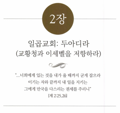 오늘날 그리스도인들도 회식자리의 술잔과 이어지는 2차 3차에 맞추려니 몸과 마음이 괴롭다. 분위기 를 맞추자니 양심은 괴롭고 피하려고 하니 회사생활이 어렵다. 두아디라 신자들에게도 동일한 어려움이 있었던 것이다. 그러나 하나님께서는 주님의 의를 구하는 사람을 결코 모른 체하지 않으신다는 것을 신뢰하고 이제는 단호하게 말씀대로 살기를 결단하자. 지금 이러한 일에서 주님의 뜻을 선택하는 용기와 믿음이 있어야 계시록 13장에 예언된 짐승의 표를 받지 않게 되는 것이다.