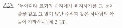 : 염색업과 함께 두아디라 산업의 쌍벽을 이루고 있던 청동 제련업에 친숙했던 두아디라 사람들에게는 생생하고 인상 깊은 표현이다. 고열 의 용광로가 뿜어내는 금속의 불꽃은 대낮도 밝혔으며 눈을 바로 뜨 지 못하게 했다. 부패한 교권이 자줏빛 영광을 두른 채 암혹시대를 펼치지만 예수께서는 용광로의 불꽃 같은 눈으로 이 암흑올 꿰뚫어 보신다. 골수와 폐부를 꿰뚫어 그불의와 죄악을보시고, 이 어두운시대동안 잔인한 교황청에 의해 감옥과 화형, 산중 토굴과 종교재판소에서 이단의 누명을쓰고 죽어간 성도들을 한 사람 한 사람 살피셨으며, 짙은 혹암 속에서 벌어지고 있는 일들의 진상을 하나도 빼놓지 않으시고 불꽃 튀는 눈으로 통찰하신다. 예수 그리스도의 이름으로 저질러 지는 타락한 교황청의 불의도 보시고 예수 그리도의 이름으로 고난 당하고 수고하며 목숨까지 빼앗기는 성도의 믿음도 낱낱이 보신다.(렘 11:20; 히 4:12,13).