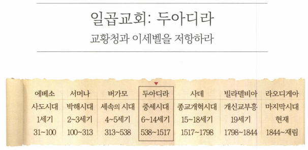 두아디라 시대를 그토록 패역하고 배도하게 만든 ‘‘자칭 선지자라 하는 여자 이세벨을 용납한’’ 중세시대 의 교회는 정치와 종교를 망라해서 권력을 휘두른 로마 카톨릭 교회이다. 이 시대를 견뎌야 했던 12세기 왈덴스인들, 13세기 옥캄(William Occam), 세기 위클리프 (John wyclif)와 얀 후스(John Hus) 등 개혁을 한 선구자들의 희생으로 드디어 종교개혁의 촛불들이 하나씩 점화된 시대이다.