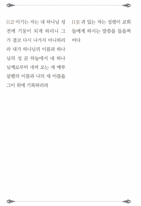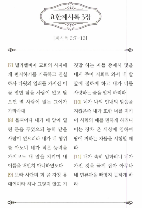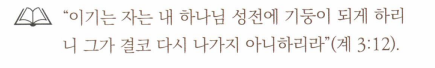 하지만, 이렇게 안정된 거처가 없이 살아가는 빌라델비아 신자들에게 예수께서는 "결코 다시 나가지 아니하리라"는 하늘에서의 영원한 정착을 보증하셨다.