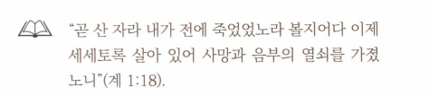 사망의 권세를 깨뜨리고 무덤의 문을 열 수 있는 열쇠를 가지신 분은 사망의 권세를 이기시고 부활하신 그리스도뿐이시다. 우리의 구주 예수 그리스도의 손에 들린 무덤의 열쇠를 바라보며 우리는 슬픔의 눈 물을 닦으면서 사랑하는 사람들을 떠나보낼 수 있다. 그리고 결국에는 우리 자신까지도 두려움 없이 무덤에 들어갈 수 있다. 왜냐하면 예수 께서 그무덤 문을다시 여실 것이기 때문이다.