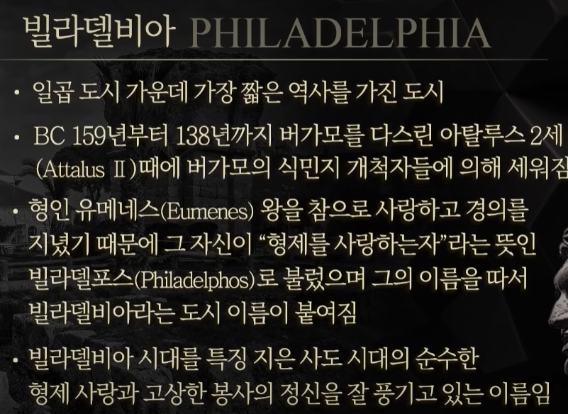 : 예수께서는 빌라델비아 선자들에게 자신을 이렇게 소개하고 있는, 이 도시는 헬라의 문화와 언어를 소아시아 지방에 전파하기 위해 설립된 길목의 도시여서 동부 고원지대로 들어가는 관문 역할을 했다.
