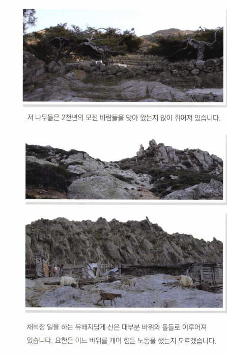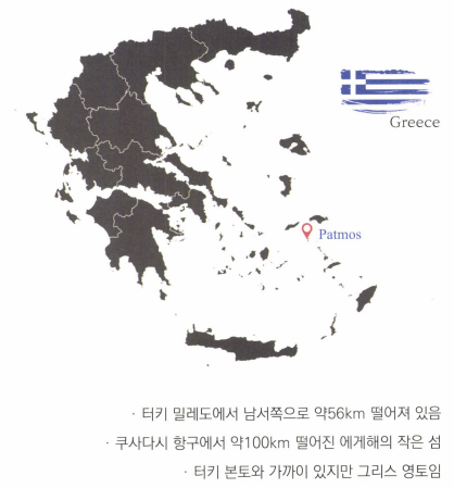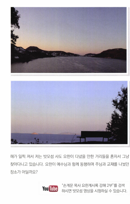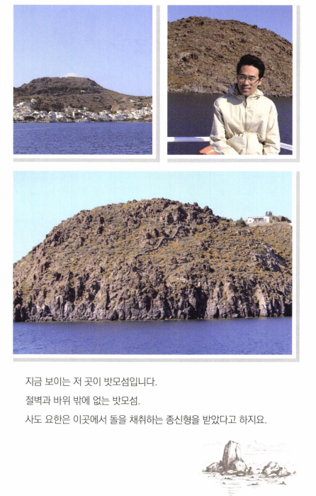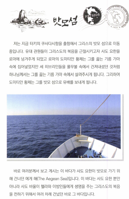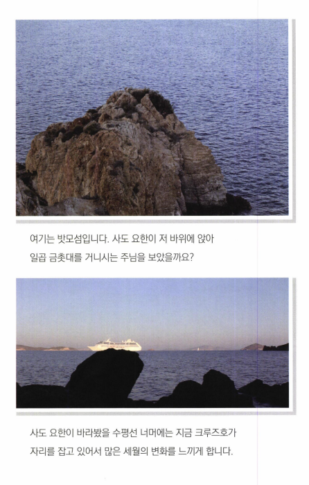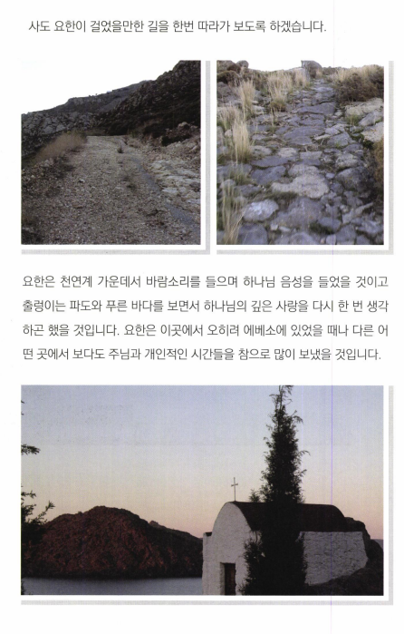 오래전에 밧모섬을 다녀올 기회가 있었다. 터키 에베소의 쿠사다시 항구에서 에게해를 건너 밧모섬으로 들어간다. 성지 순례하는 분들은 대부분 여행사와함께 다니기 때문에 밧모섬에 가서 요한이 계시를 보았다는 동굴이나 사도 요한 수도원 정도를 보게 되는데 나는 동굴을 잠깐 살펴본 후에, 혼자 서너 시간 밧모섬 자체를탐방해 보았다. 해변 을 따라 걷기도 하고, 바위산 정상에 올라가 보기도 하면서 사도 요한 이 걸었고, 일했고, 계시 를보았을 만한곳들을 살펴보았다.