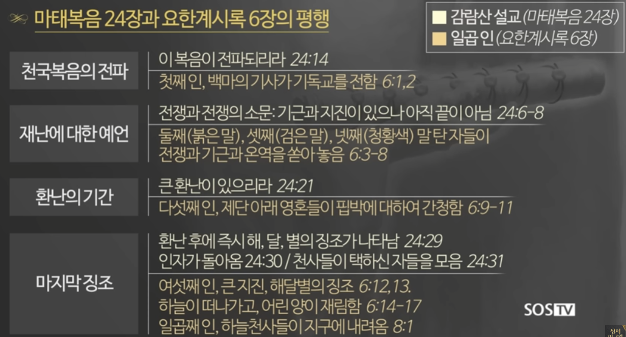 마태복음 24장에 보면 예수께서 감람산에서 제자들에게 하신 세상 끝에 관한 말씀이 나오는데, 그 말씀은 계시록 6장의 일곱 인과 평행을 이루고 있음을 발견하게 된다.
