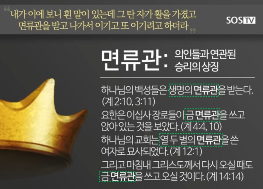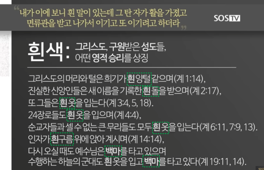 "나는 어린 양이 일곱 봉인 가운데 하나를 떼시는 것을 보았습니다. 그때 내가 들으니 네 생물 가운데 하나가 천둥 소리와 같은 음성으로 "오너라!" 하고 말했습니다. 내가 보는 순간 내 앞에는 흰 말 한 마리가 있었고 그 위에 탄 사람은 활을 가졌으며 면류관을 받고 나가서 이기고 또 이기려고 했습니다" (계 6:1,2 | 현대인의 성경).