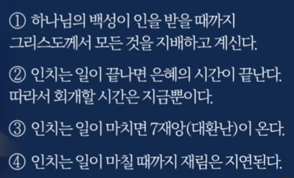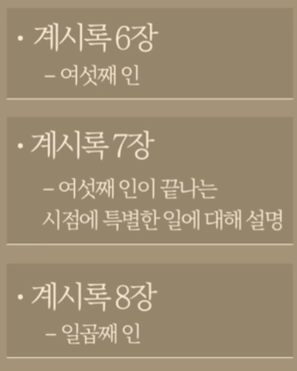 계시록 6장에서 일곱 인이 나오는데 여섯째 인까지 설명되고 끝났다. 그러면 7장에서 일곱째 인이 나와야 하는데, 일곱째 인은 8장에서 나오기 때문에 7장은 여섯째 인이 끝나는 중요한 시점에 뭔가 특별한 일이 벌어진다는 것을 우리에게 알려준다.