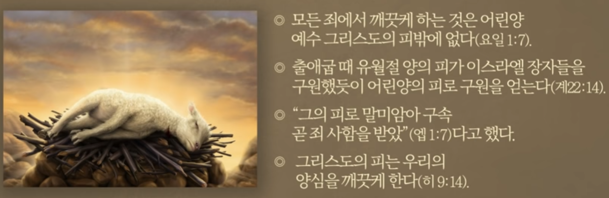 피는 붉은데 그 피가 희게 한다는 사상은 참 역설적인 표현이다. 어린양의 피는 그리스도의 십자가의 죽음을 의미한다. 모든 죄에서 깨끗케 하는 것은 어린양 예수 그리스도의 피밖에 없다(요일 1:7). 출애굽 때 유월절 양의 피가 이스라엘 장자들을 구원했듯이 어린양의 피로 구원을 얻는다. "그의 피로 말미암아 구속 곧 죄 사함을 받았"(엡 1:7)다고 했다. 또한 그리스도의 피는 우리의 양심을 깨끗케 한다(히 9:14).
