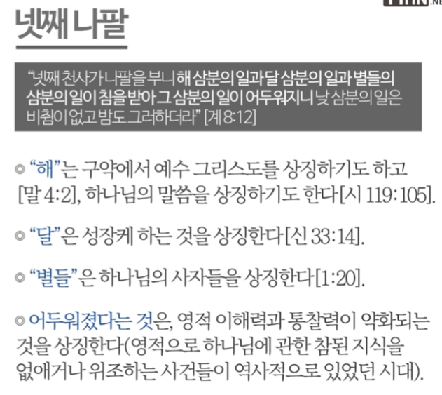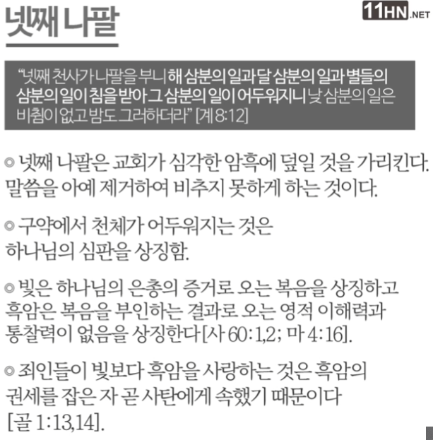 "[12] 넷째 천사가 나팔을 부니 해 삼분의 일과 달 삼분의 일과 별들의 삼분의 일이 침을 받아 그 삼분의 일이 어두워지니 낮 삼분의 일은 비췸이 없고 밤도 그러하더라"(계 8:12).