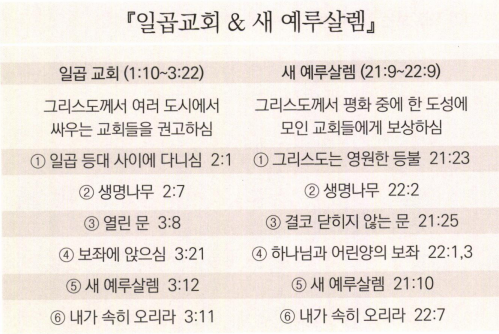 이런 식으로 모든 장이 연결돼 있는 것을 알면 그 문학적 구조에 감탄을 금치 못할 것이다. 요한계시록 전반부는 일곱 교회에 보내 는 편지를 기록하고 있고, 후반부는 새 예루살렘교회를 묘사하고 있다. 전반부에서는 하나님의 교회가 일곱 도시에 홑어져 시련과 박해를 당하지만, 후반부에서는 하나님의 교회가 하나의 도시 곧 영화로운 새 예루살렘과 하나 되어 다시 자리를 잡고 있다. 전반부 에서는 교회들이 이 땅에서 죄와 더불어 싸움을 싸우고 있고, 후반부에서는 교회가 평화를 누리고 있다. 이 사실을 표로 확인해 보자.