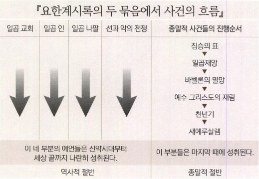 요한계시록은 하나님의 지성과 사랑으로 저술된 내적 예술성을 간직한 책이다. 이 카이아즘 구조를살펴보면, ‘‘요한계시록예언중에 어느 부분이 아직 성취되지 않았는가?’ 하는 질문에 대한 해답이 풀리기 시작한다. 교차대구의 구조에 의하면 후반부 전체가 아직도 미래에 속한다. 일곱재앙과 영적 바벨론의 멸망은 미래사건이다. 재림과 천년기 간도 미래이고, 새 예루살렘의 도래도 미래사건이다. 요한계시록 전반부는 초대교회부터 현재까지의 전 기독교 시대의 역사와 관련이 있다. 이처럼 요한계시록은 두 개의 주요 묶음으로 나누어진다. 하나는 마지 막사건들을 취급하고 있고, 다른 하나는 기독교시대에 걸친 하나님의 백성들의 경험을 다루고 있다. 전반부는 역사적 부분이고, 후반부는 종말적 부분이다. 한 가지 특이한 점은 전반부인 역사적인 부분은 2천년의 시간이 걸렸지만 종말적인 부분은 짧은 기간에 예수님의 재림까지 이른다. 갑자기 이뤄지는 사건들이다.