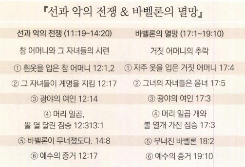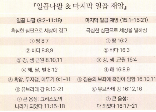 일곱 나팔은 악한 사람들에게 돌이켜 회개하라는 심판의 경고이고, 일곱재앙은 회개하지 않은 악한사람들을 심판하는 내용이다. 일곱나팔이 끝나고 진행되는 다음 장면은 하나님의 백성과 사탄의 세력 간의 전쟁이 벌어지는 일에 초점이 모아진다. 일곱 재앙 이후에는 바벨론이 멸망하는모습이 그려진다. 이게 어떤 구조로되어 있는지 표로 살펴보자.