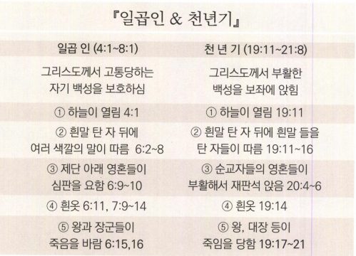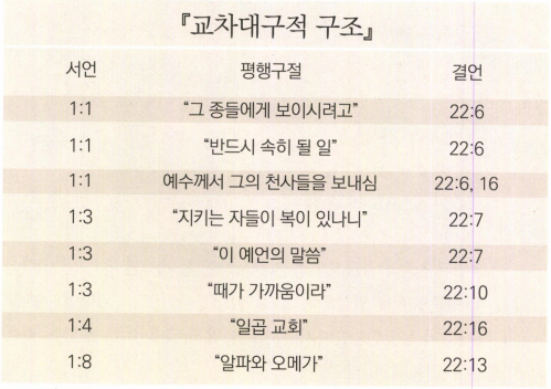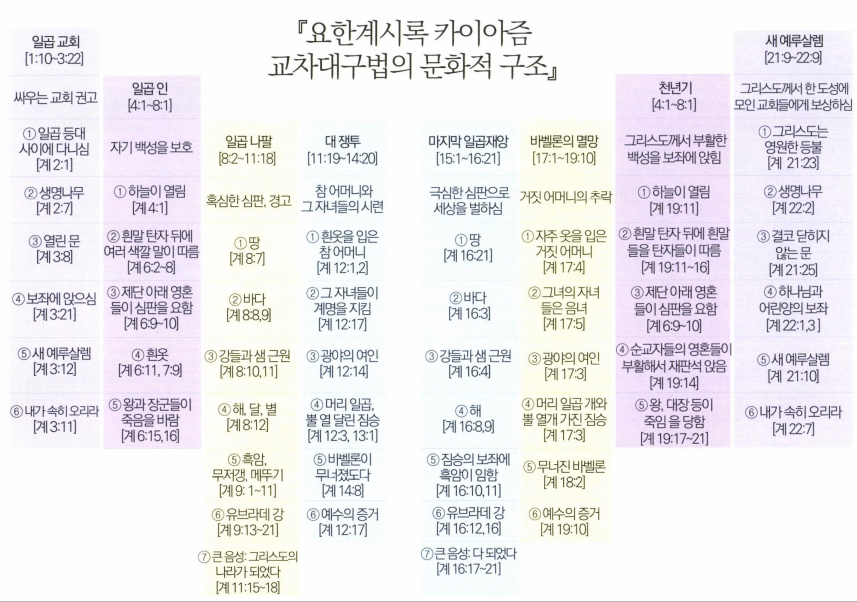 지금까지 나누어서 소개한 이 표들을 하나로 합쳐보자. 요한계시록의 키이아즘 교차 구법의 문학적 구조가 얼마나 신비롭게 펼쳐져 있 는지놀랄 것이다.