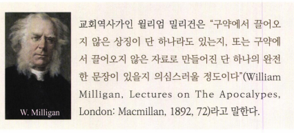 그러므로 구약의 배경에 비추어 상징들을 이해하는 것이 안전하다. 그렇지 않으면 요한계시록이 아니라 “내가 계시록 이 탄생한다. 내가 생각하고 끼는 대로 해석해서 오늘날 이렇게 혼잡한 것이다. 구약에 대한 이해 없이 요한계시록을 연구하는 사람은 계시록을 해석하기가 불가능하다는 을 알게 될 것이다. 그래서 구약이 요한계시록의 상징 들을 푸는 열쇠이다. 예를 들어 계시록 장과 장의 묵시는 신명기 17 장과 열왕기하 11 장 라엘 왕들의 대관식에 기초돼 있으며, 레위기 26장의 언약에 관한 내용이 일곱 인의 묵시적 배경이 되고, 유리바다 위에 서서 모세와 어린양의 승리를 노래하는 144,000 인은 출애굽기 15 장의 경험이며 , 계시록 16장은 이사야 44장과 예레미야 50장에 서 등장한 페르시아 왕 고레스와 그의 군대의 바벨론 점령 역사에 어 떻게 연결돼 있는지 보여준다. 나팔, 무저갱에서 나온 메뚜기, 소돔과 애굽 시온 산, 유프라테스, 아마겟돈 전쟁 이러한 모든 것들은 이스라 엘의 역사에서 빌려온 것이다. 요한계시록의 예언들은 창조, 홍수, 출애굽, 하나님과 다윗 왕과의 언약, 바벨론 포로생활 등 구약의 가장 위대하고도 중요한 사건들에 기초돼 있다. 이 사건들은 하나님의 미래 구원활동은 하나님의 과거 구원활동과 매우 흡사할 것이라는 이해 위에 독자들의 믿음이 구축되도록 의도되었다. 과거에 자기 백성을 위하여 놀라운 일을 행하신 바 로 그 능하고 미쁘신 하나님께서는 현재도 동일한 일을 행하고 계시는 , 그분은 자기 백성의 미래와 관련하여 주신 약속들을 분명히 지키 는하나님이시다. 과거에 늘 함께하셨던 동일한 하나님이 미래에도 역 시 자기 백성들과 함께하실 것을 알려주고 있는 책이 요한계시록이다.