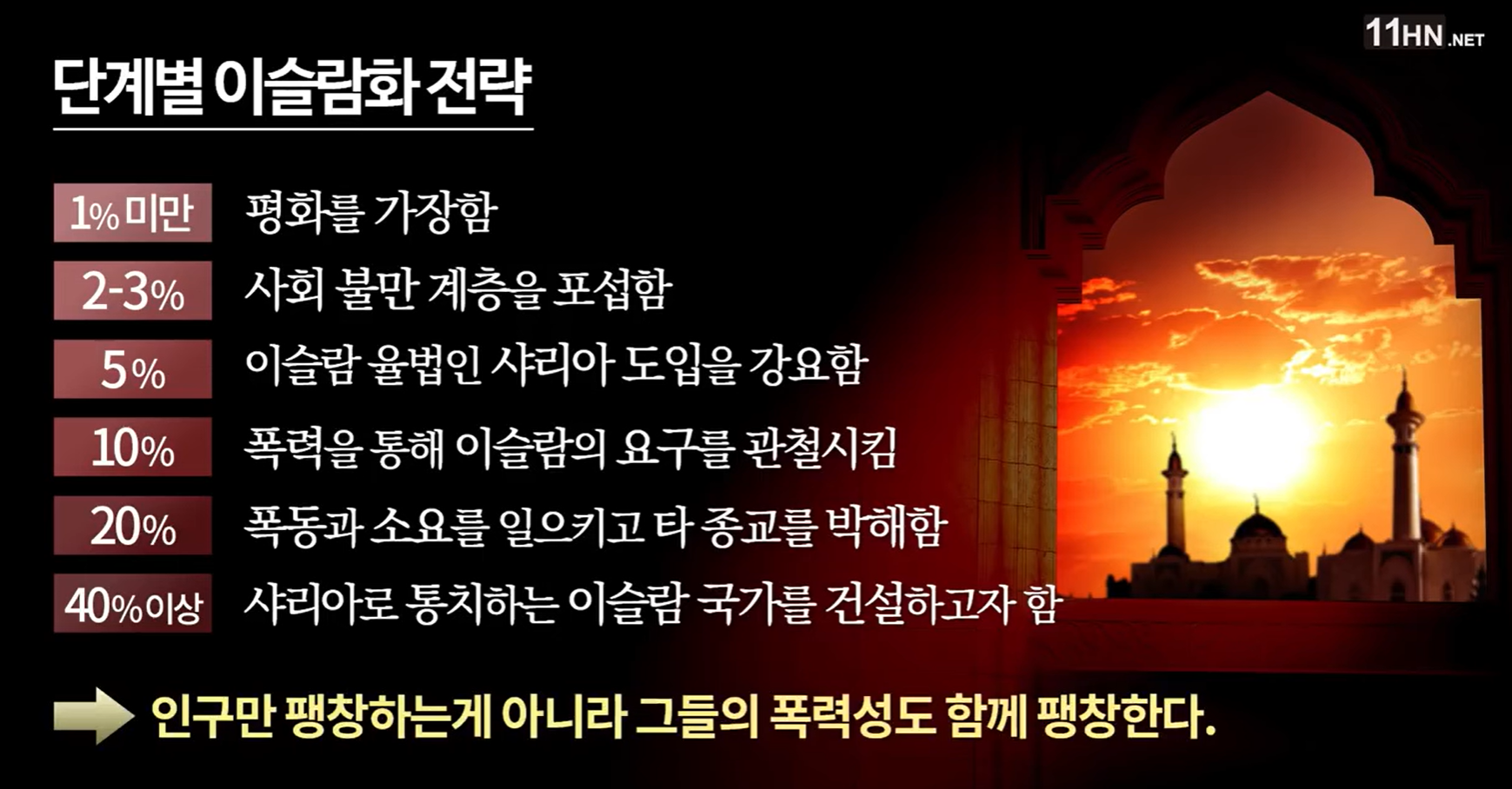 사람들은 이슬람 극단주의자들만 테러를 한다고 생각하는데, 그렇지 않다. 파리테러, 런던테러 이런 일들이 생기고 다음 날 이슬람국가의 조간신문에 "우리의 자랑스런 젊은이들이 적진의 심장부에 들어가 위대한 일을 해냈습니다."라는 기사가 실리고, 하루 종일 테러 모습을 보여주면서 "우리의 전사들, 우리의 형제들이 위대한 알라의 뜻을 이뤘습니다!"라고 방송한다. 온 세계가 놀라고 있을 때, 이슬람권에서는 축제 분위기인 것이다.