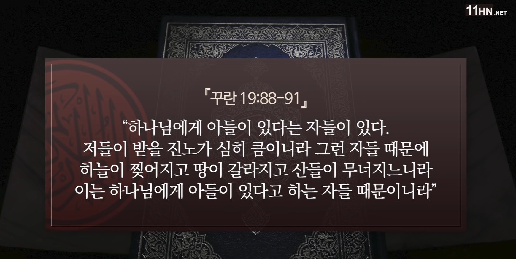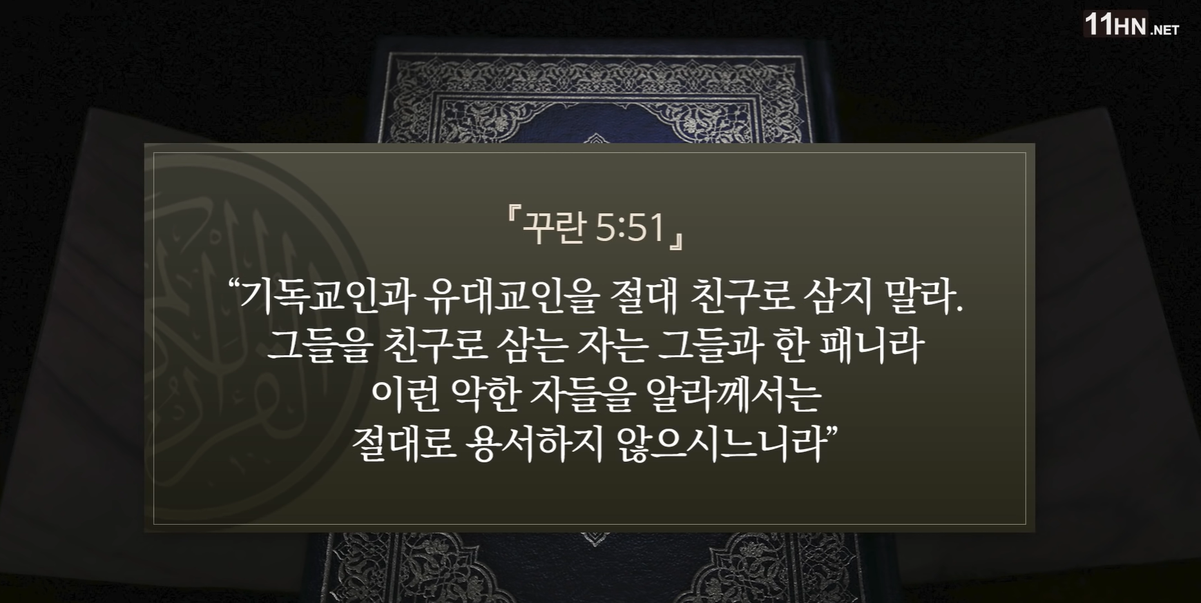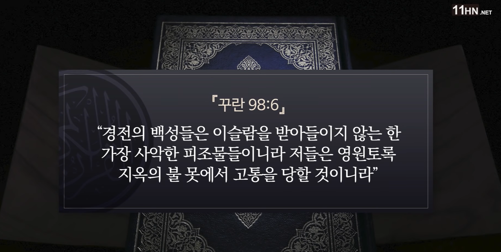 이것이 꾸란의 가르침이다. 무슬림들이 메카를 향해서 하루 다섯번 기도하는데, 기도할 때 개인의 기도를 올리는 것이 아니다. 이슬람권에서는 하루 다섯 번씩 TV에서 기도하는 것을 방송해준다. 기도문에 맞춰서 화면이 바뀌는데, "알라의 진노를 받은 자들"구절이 나올 때는 유대인의 회당을 비춰준다. "방황하는 자들" 구절이 나올 때는 교회의 십자가를 보여준다. "옳은 길로 인도하소서" 할 때는 모스크를 비춰준다.