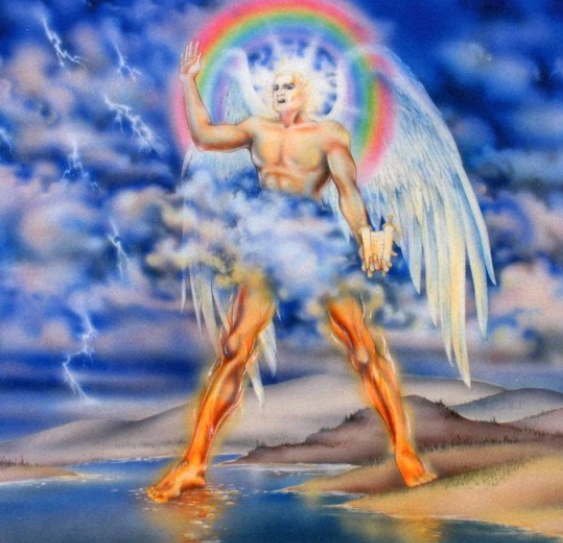 "[1] 내가 또 보니 힘센 다른 천사가 구름을 입고 하늘에서 내려 오는데 그 머리 위에 무지개가 있고 그 얼굴은 해 같고 그 발은 불기둥 같으며"(계 10:1).