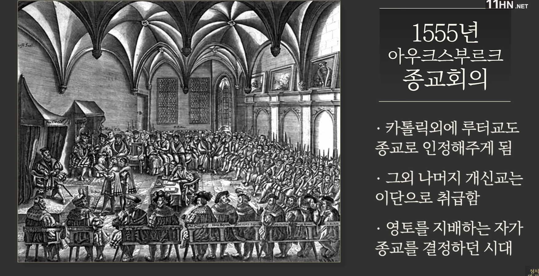 유럽에서는 오직 하나의 종교인 카톨릭만 있었는데, 종교개혁의 영향으로 개신교를 받아들인 독일 제후들의 세력이 커지자 1555년 아우크스부르크 종교회의에서 카톨릭 외에 루터교도 종교로 인정해 주게된다. 그 외 나머지 개신교는 이단이었다. 그런데 그것도 개인의 선택이 아니라 그 지방의 영주가 어떤 종교를 가지고 있는가에 따라서 주민들의 종교도 결정되었다. 영토를 지배하는 자가 종교를 결정하던 시대였기 때문이다. 영주가 루터교면 백성들은 루터교 신자가 되는 것이고, 카톨릭이면 카톨릭 신자가 되는 것이다.