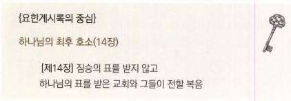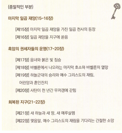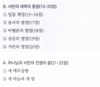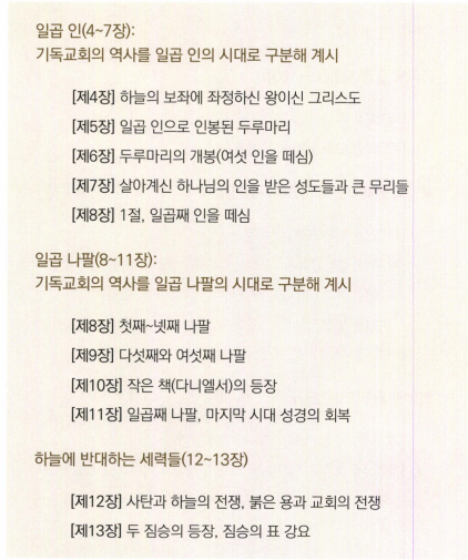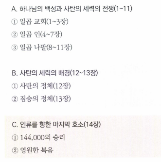 요한계시록은 총 22장인데 크게 다섯 부분으로 되어있다. 14장을 중심으로 해서 장부터 13장까지는 역사적 기록이고 15 장부터 22장 까지는 종말론적 기록이다.
