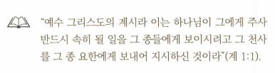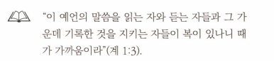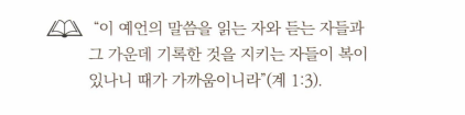 이 책은 너무 신비롭고 깊어서 이해할 수 없으니 읽거나 알아볼 필 요가 없다 하여 무관심하거나 버리는 교회들이 있다. 그러나 성경 자체가 우리로 부지런히 읽고 연구하여 지키기를 요구한다. 그 이유는 그리스도가 만왕의 , 만주의 주로 이 땅에 재림하실 날이 가까웠기때문이라고 이유를 밝히고 있다. 그러므로 우리는 부지런히 이 책을 읽고 연구하여 그 안에 있는 빛을 따라 지키는 것이 참된 그리스도인 의 의무이다. 그야말로 이 책은 예수 그리스도의 계시이다. 예수 그리 스도께서 다시 오실 시간이 다 되었다. 주님 맞을 거룩한 신부로 준비 되기 위해 성경의 예언들을 연구하자.