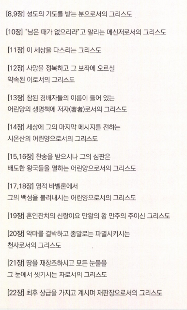 성경의 마지막 책인 요한계시록, 이 책은 다기올 사건들인 아마겟돈 전쟁, 기근, 박해 , 심판 이런 것들에 대한 단순한 계시가 아님을 이해해야 한다. 이 책은 "예수 그리스도의 계시"라고 분명히 밝히고 있다. 예수님이 주신 계시라는 의미 외에 예수 그리스도에 대한 계시라고 해도 틀리지 않다. 아니 오히려 예수 그리스도에 대한 계시라고 해야 할 만큼 다른 성경에서는 발견할 수 없는 그리스도의 모습이 곳곳 에서보여진다.