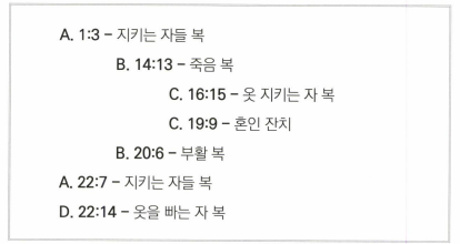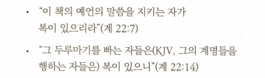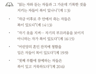 "복이 있나니’’ 이 복은 단순히 세속적 의미의 복을 말하는 것이 아니다. 하나님께서 약속하신 구원을 오랫동안 기다렸던, 이제 그 성취 를 경험하게 되는 사람들의 최고의 행복을 말한다. 계시록에는 7가지의 복이 등장하는데, 그 중 첫 번째 복이다.