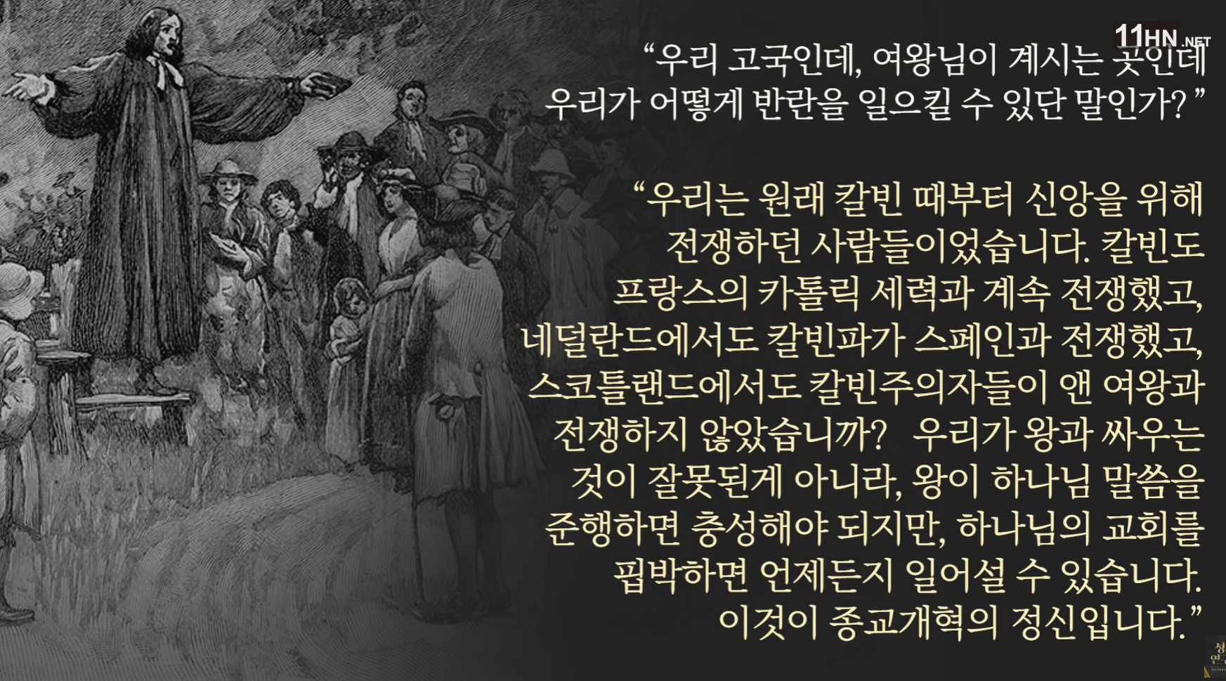 미국의 독립전쟁 때, 제일 주도적으로 나섰던 사람들이 청교도 목회자들이었다. 설교 때마다 우리가 왜 독립해야 하는지, 왜 우리가 독립운동을 해도 되는지 끊임없이 고취시켰다. 왜냐하면 사람들이 아무리 영국의 횡포가 심하다 하더라도 "우리 고국인데, 여왕님이 계시는 곳인데 우리가 어떻게 반란을 일으킬 수 있단 말인가?" 이렇게 생각하니까, 목회자들은 "우리는 원래 칼빈 때부터 신앙을 위해 전쟁하던 사람들이었습니다. 칼빈도 프랑스의 카톨릭 세력과 계속 전쟁했고, 네덜란드에서도 칼빈파가 스페인과 전쟁했고, 스코틀랜드에서도 칼빈주의자들이 앤 여왕과 전쟁하지 않았습니까? 우리가 왕가 싸우는 것이 잘못된 게 아니라, 왕이 하나님 말씀을 준행하면 충성해야 하지만, 하나님의 교회를 핍박하면 언제든지 일어설 수 있습니다. 이것이 칼빈의 정신입니다" 하면서 교회가 독립운동의 중심지가 되고 목사들은 독립운동을 선동하는 독립운동가들이 된다. 당연한 결과로 미국이 독립선언서를 수립할 때 목사들이 많이 참석했고 미 의회가 세워졌을 때 국회의원 중에 목사들이 많았다.