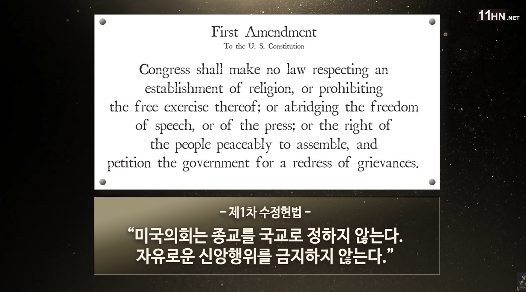 이 내용이 헌법에 들어가게 된다. 정치와 종교의 분리를 헌법으로 확정한 세계 최초의 국가가 미국이다. 내가 믿고 싶은 대로 믿어도 국가의 처벌을 받는 않는 나라! 이것을 보장한 것이다.