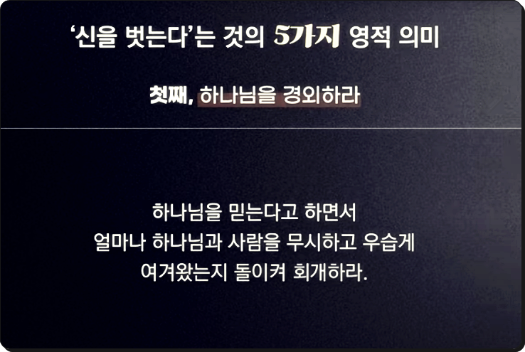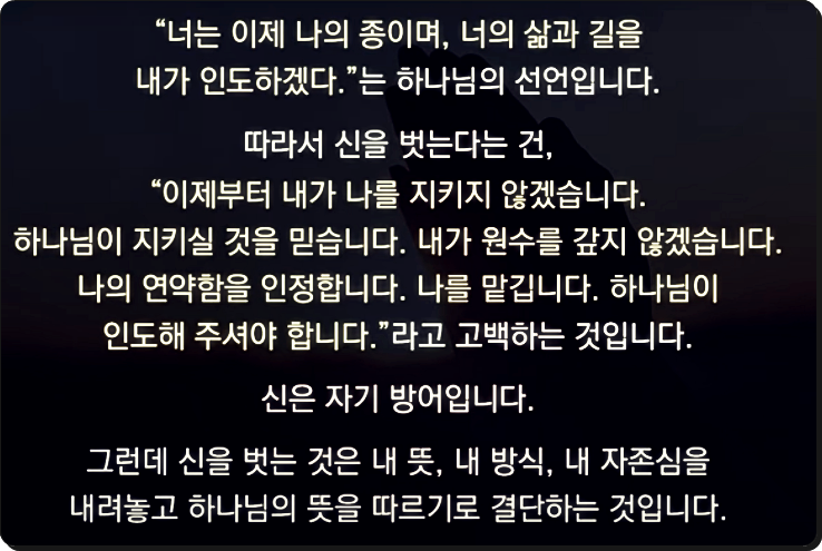 하나님께서 모세와 여호수아에게 하신 말씀, “신을 벗으라”는 단순한 행위 이상의 깊은 영적 메시지를 담고 있습니다. 이 말씀은 지금 우리에게도 그대로 적용됩니다. 하나님 앞에서 우리가 어떤 자세로 살아야 하는지, 신앙의 본질을 다시금 되새기게 합니다.