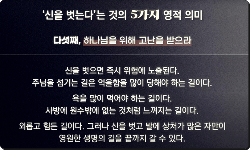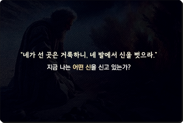 신발은 우리의 발을 보호해주는 도구입니다. 신을 벗는다는 것은 곧 위험에 노출된다는 의미이기도 하죠. 하나님께서 신을 벗으라고 하신 것은, 이제부터는 편한 길이 아니라 좁은 길, 고난의 길, 자기를 부인하는 길을 걷게 될 것이라는 뜻입니다. 고대 노예들은 신을 신지 않았습니다. 하나님을 따르는 길은 억울함과 외로움, 이해받지 못하는 아픔이 따르기도 합니다. 그러나 신을 벗은 자, 즉 고난을 감수하겠다는 각오를 한 자만이 끝까지 하나님의 길을 갈 수 있습니다. 맨발로 걷는 삶은 힘들지만, 영원한 생명의 길입니다.