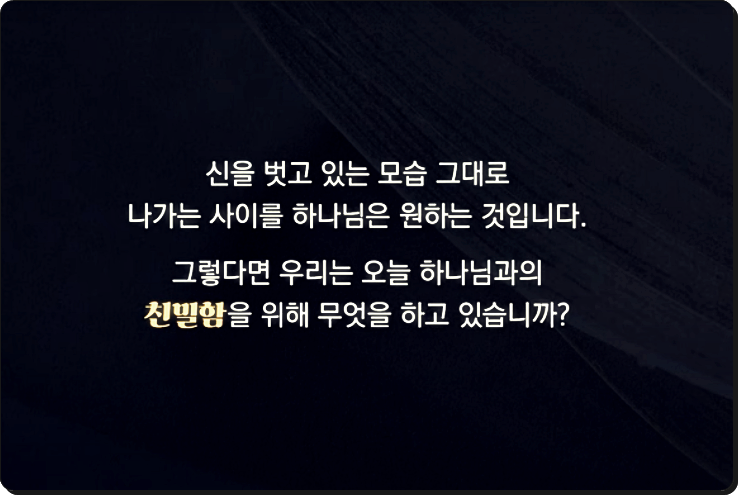 발은 우리의 가장 연약한 부분 중 하나입니다. 그 발을 드러내는 것은 친밀함과 신뢰의 표시입니다. 하나님께서 신을 벗으라고 하신 것은 우리와 친밀한 관계를 맺기 위함입니다. 하나님은 우리를 사명자로 세우기 전에 친구로 먼저 만나기를 원하십니다. 발을 내보일 수 있을 만큼 가까운 관계, 그것이 하나님과의 친밀함입니다. 우리가 하나님과 친밀해지려면, 먼저 우리의 연약함과 부끄러움을 감추지 말고 그대로 하나님께 내어 놓아야 합니다. 신을 벗는 자만이 하나님의 사랑을 깊이 누릴 수 있습니다.