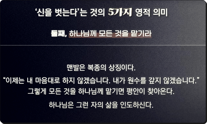 고대 사회에서 노예는 신발을 신지 않았습니다. 이는 자신이 자유인이 아니며, 자신의 길을 선택할 수 없음을 의미했죠. 하나님께서 모세와 여호수아에게 신을 벗으라고 하신 이유는, 이제부터 그들의 삶을 하나님께서 인도하시겠다는 뜻이었습니다. 신을 벗는다는 것은 내 뜻과 방식, 자존심을 내려놓고 하나님의 인도하심을 전적으로 신뢰하는 자세입니다. 우리가 삶의 문제를 스스로 해결하려고 애쓰기보다, 하나님께 맡길 때 진정한 평안이 임합니다. 신을 벗은 자는 하나님이 지켜주실 것을 믿고 조바심 내지 않습니다.