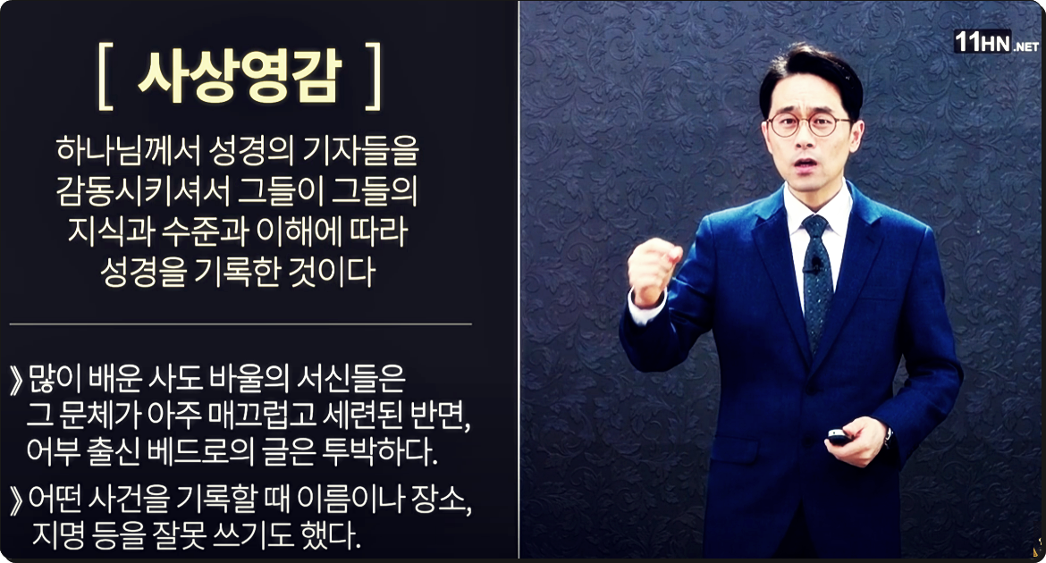 손계문 목사는 성경 해석의 기준으로 '사상영감'을 제안합니다. 이는 하나님이 성경 저자들에게 말씀을 감동으로 주셨으나, 그 표현 방식은 각 저자의 지식, 언어, 문체를 통해 기록되었다는 의미입니다. 다시 말해 성경은 하나님의 뜻을 담고 있지만, 그 전달은 인간을 통해 이루어진다는 점에서 문법적 오류나 편집상 실수는 존재할 수 있다는 입장입니다. 예를 들어 마태복음 27장에서 인용된 선지자의 이름이 예레미야로 잘못 표기된 사례를 들 수 있습니다. 이러한 오류가 성경 전체의 권위를 훼손하는 것은 아니며, 오히려 인간 저자의 한계와 하나님 은혜의 공존을 보여주는 증거일 수 있습니다. 이처럼 사상영감은 성경을 절대화하거나 무조건 비판하는 두 극단을 피하고, 성경 본래의 메시지와 중심 진리를 정확히 이해하고 순종하게 만드는 건강한 해석 방법입니다. 우리는 성경의 글자 하나에 매달리기보다는 그 안에 담긴 하나님의 마음과 의도를 깊이 있게 묵상해야 할 것입니다.