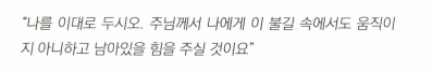 결국 폴리캅은 화형을 당하게 되었는데, 불 속에서 움직이지 못하도록 기둥에 못을 박으려 하자 차분한 어조로 말했다.